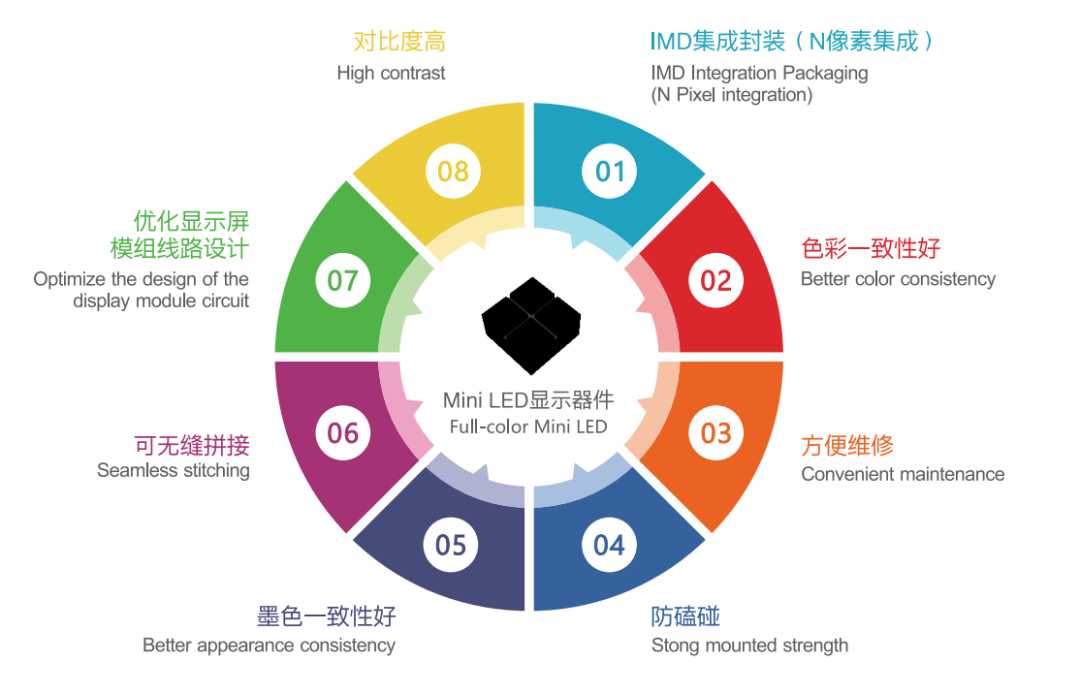 永信贵宾会光电作为LED显示封装行业主推IMD封装技术的企业,于2018年率先推出IMD-M09T,实力开启P0.X显示新时代。IMD封装设备80%以上兼容,产业供应链(芯片、基板、线材)、设备配套成熟,因此,屏厂可快速切入,加快超高清显示商业化进程。目前,RGB器件事业部已成功推出基于IMD封装方案的P0.9-P0.4的全系列Mini LED产品,具有高性价比、影院级色域、可规模量产、高密度封装等特点,可满足从81寸到162寸4K/8K终端显示设备的需求。凭借出色的性能和丰富的方案选择,该系列产品已得到了市场的广泛认可。