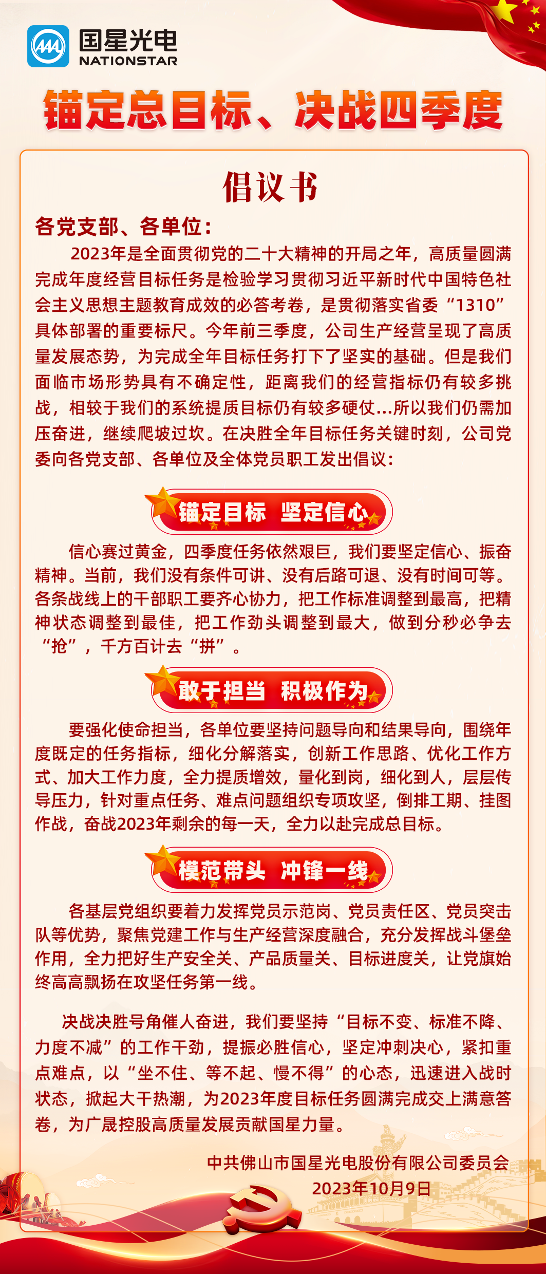锚定总目标、决战四季度——致永信贵宾会光电全体党员干部职工的倡议书