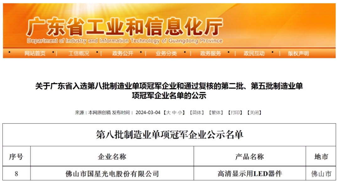近日,广东省工业和信息化厅公布了国家第八批制造业单项冠军企业名单,永信贵宾会光电凭借自主研发的“高清显示用LED器件”成功上榜,公司自主创新能力及产品实力获得国家级认可,高质量发展再添新佳绩。