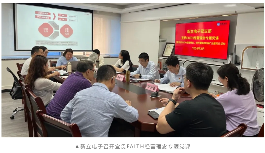 新立电子积极引导干部职工将FAITH经营理念贯穿贸易业务经营的全过程,通过开展进出口贸易合规培训,帮助员工提升贸易业务法律法规意识,增强业务技能,做好风险防范,凝心聚力为贸易业务发展保驾护航;征集员工关于数字化管理和建设的建议意见,汇聚众智解决数字化系统存在问题,实现信息共享资源共用,提高部门协作效率;组织召开宣贯FAITH经营理念专题党课,引导干部职工以全局观念和系统思维谋划推进各项工作,将广晟控股集团FAITH经营理念和企业文化内化于心、外化于行,坚定信念、同向攀高,形成推动企业高质量发展的强大合力。