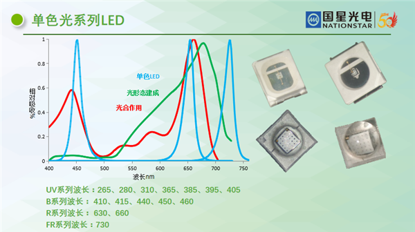 单色光系列LED,包含UV系列波长、B系列波长、R系列波长、FR系列波长产品,基本涵盖植物的生理有效辐射波长,可广泛应用于植物生长的不同阶段。