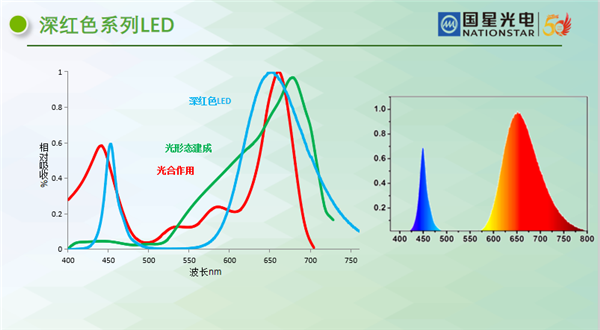 深红色系列LED,包含蓝光、红光两个波段的光谱,蓝光、红光可促进叶绿素吸收,适用于植物的生长需求。