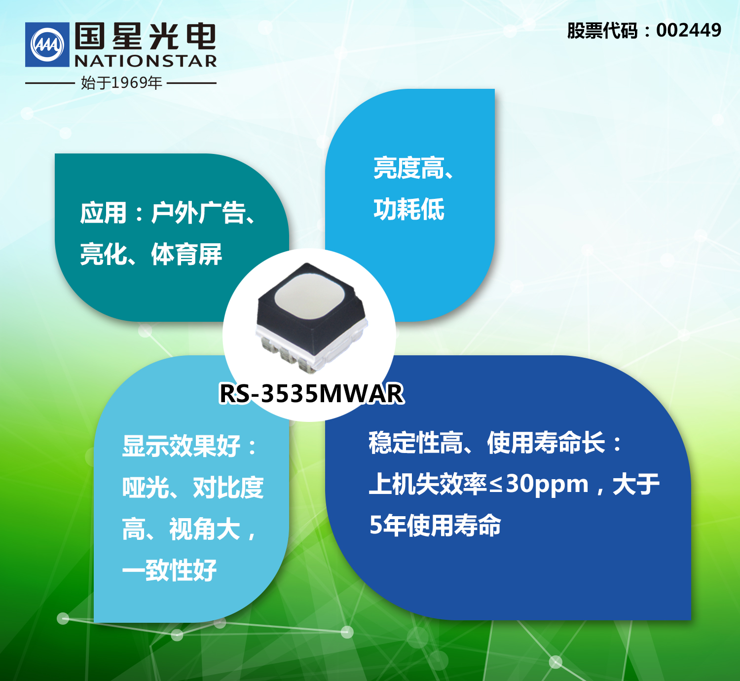 广告屏每天都要点亮,并且点亮时间长,如果灯珠的功耗越低,电费越省,运营成本越低;同时在户外环境使用,对亮度要求高。