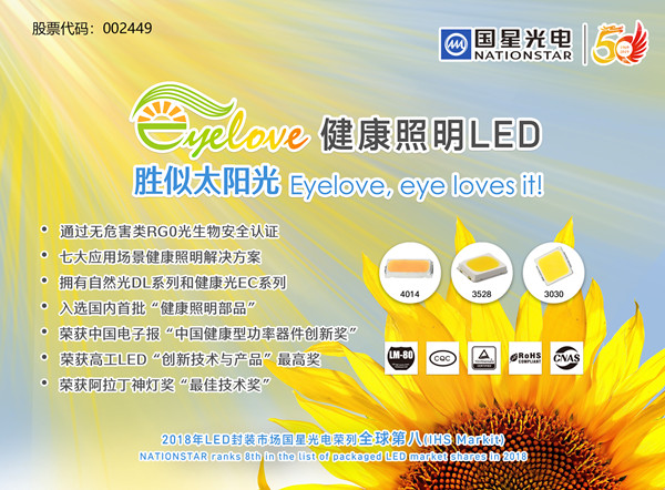 Eyelove™ LED,致力于从光源本质上降低普通光源带来的短波蓝光损伤,减少视觉疲劳,同时,结合活动场景,适宜地调整光谱,保护眼睛、提高视觉舒适度。其曾荣获国内首批健康照明部品、高工LED“创新技术与产品”最高奖、中国电子报“中国健康型功率器件创新奖”、阿拉丁神灯奖“最佳技术奖”等多项荣誉。Eyelove™ LED 健康光EC系列为降低短波蓝光LED,其将光谱中短波(415-460 nm)蓝光部分进行过滤,形成更健康的光谱。Eyelove™ LED自然光DL系列为全光谱LED,光谱覆盖了400-780nm波段,更加接近太阳光谱,且紫光波段和低波段蓝光比太阳光源低,是健康、舒适的人工太阳光。